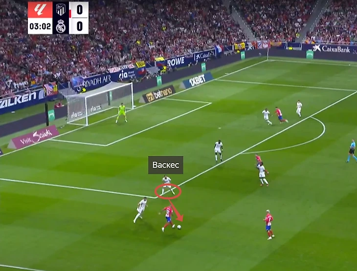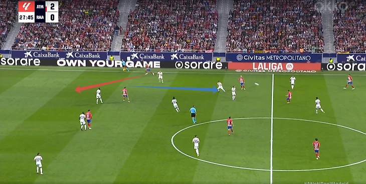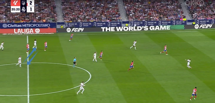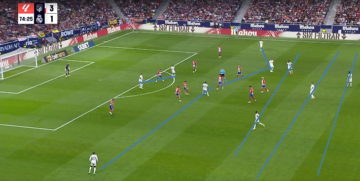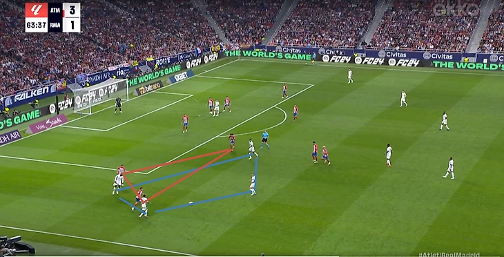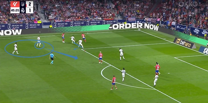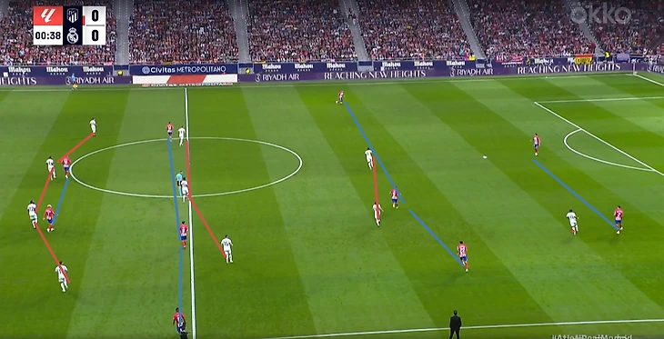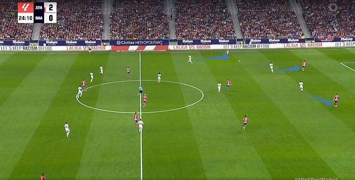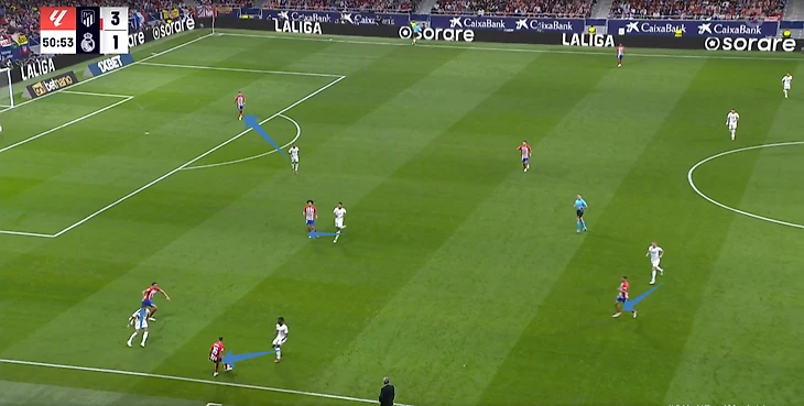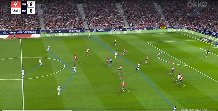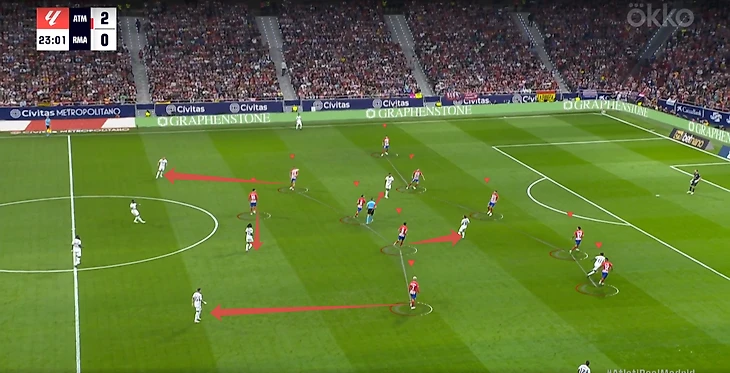 2) Прессинг остался тем же, только функции Модрича стал выполнять Беллингем, а его функции - Хоселу. Но сам прессинг не изменился левый фланг Атлетико по прежнему открыт