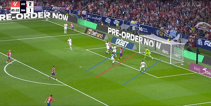 Так как у Атлетико все голы пришли с флангов, то на еще одном эпизоде, который не закончился голом покажу эту проблему
