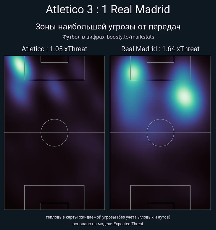 Эта тепловая карта показывает, что Атлетико был наиболее опасен с левого фланга, так как там было больше свободного места вследствие плохого прессинга Реала.