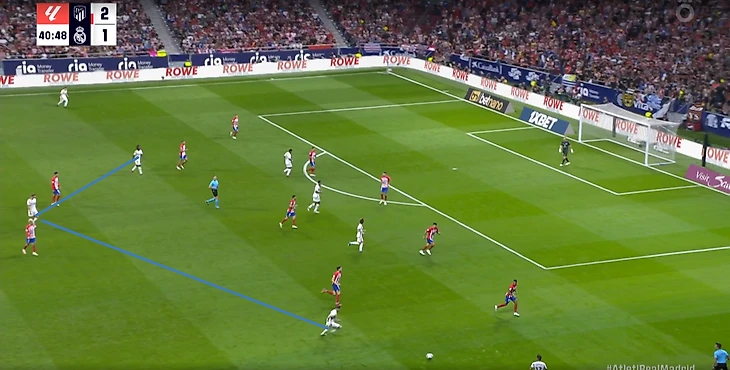 Благодаря спусканиям Гризманна в четвертку полузащитников, Атлетико не давал создавать Реалу численное преимущество в центре. Однако Камавинга, Кроос и Вальверде даже старались подниматься вверх запутывая соперников. Я думаю, этим Карло Анчелотти хотел сделать Реал более устойчивым к контратакам соперника, из-за чего пришлось пожертвовать креативом. Очевидным слабом месте в такой расстановке Атлетико были фланги, но Реал ими не пользовался, так как был слишком осторожен. Из-за изолированности флангов и плотности центра поля Реал ничего не мог создать, поэтому сваливался на дальние удары. Гол Крооса был 6 дальним ударом, что говорит о безыдейности в атаке.