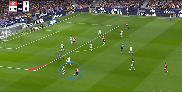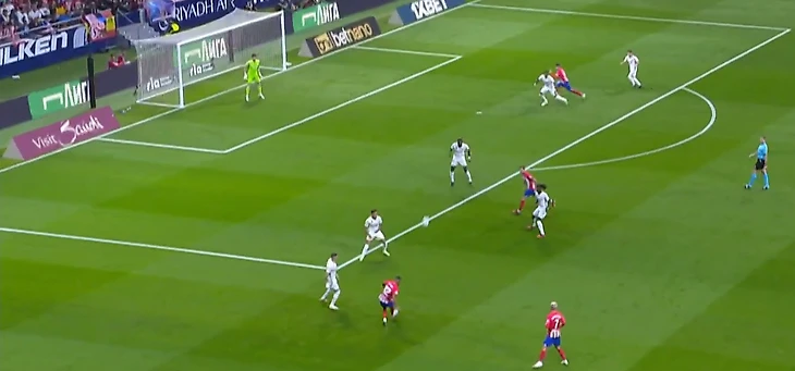 Выход Браима Диаса сильно изменил структуру атаки, поскольку он стал играть правым вингером, в результате чего Алаба поднялся на позицию Крооса, а Вальверде до конца игры играл гибридную функцию, когда команда с мячом он играл справа, а без мяча слева. Но во многом игра в атаке у Реала превратился в хаус, потому что у Тчуамени и Беллингема были свободные роли, только первый играл ниже второго. Сзади оставались быстрые Вальверде и Рюдигер на случай контратак