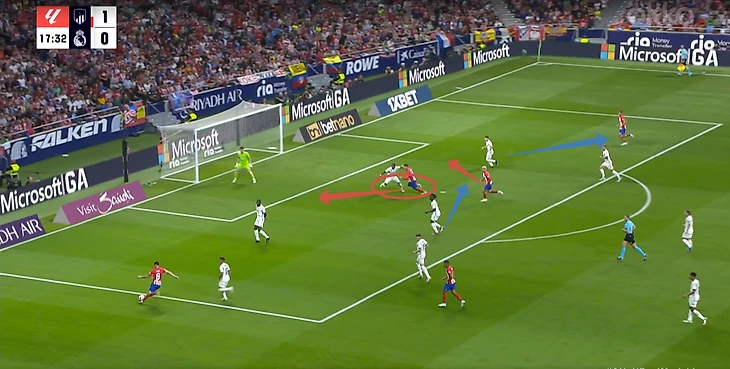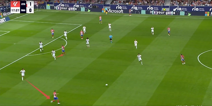 Но в итоге прессинг не приносил пользы, а скорее еще больше разрушал оборонительную структуру Рела, потому что на другом фланге был все время свободный Эрмосо, а прессингующая группа не успевала быстро накрывать иигроков Атлетико, в результате чего у хозяев проблем с выходом из-под прессинга не возникло, а у Реала образовывалось много свободного места на левом фланге, с которого пришли три голевые атаки, не все с быстрого розыгрыша, но все же.