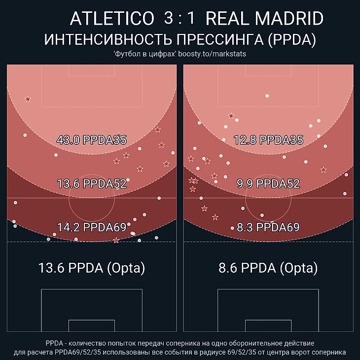 Теперь давайте рассотри второй аспект в игре в обороне Реала и в атаке Атлетико - прессинг. Реал активно включался в прессинг, но это было не эффективно, так как его частью были 33 летний Кроос и 37 Модрич.