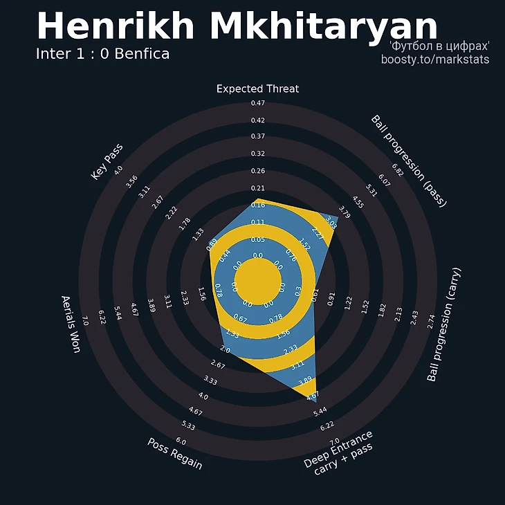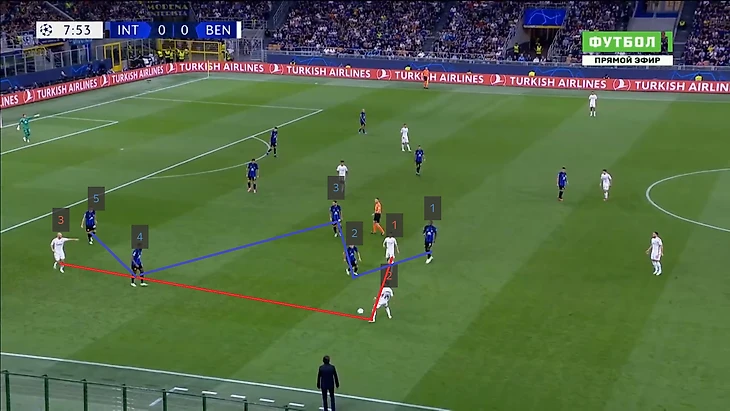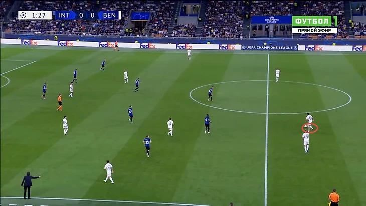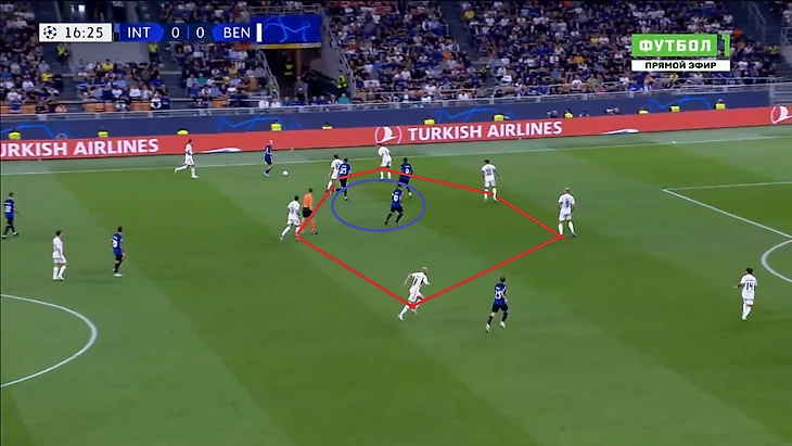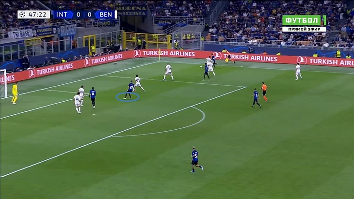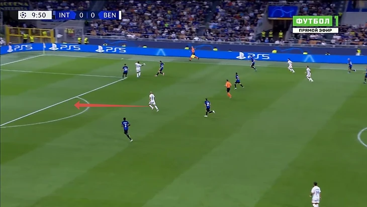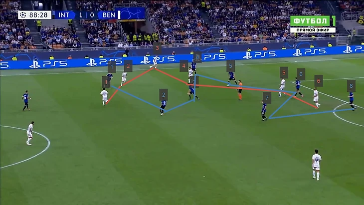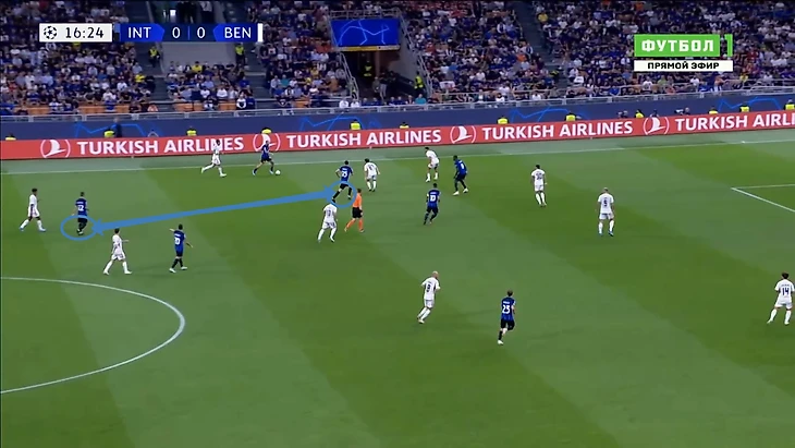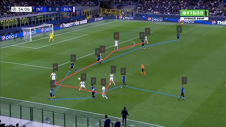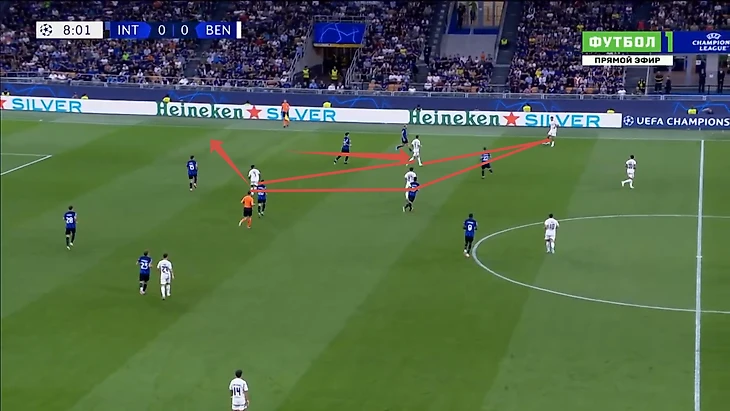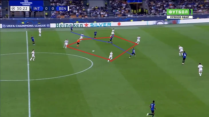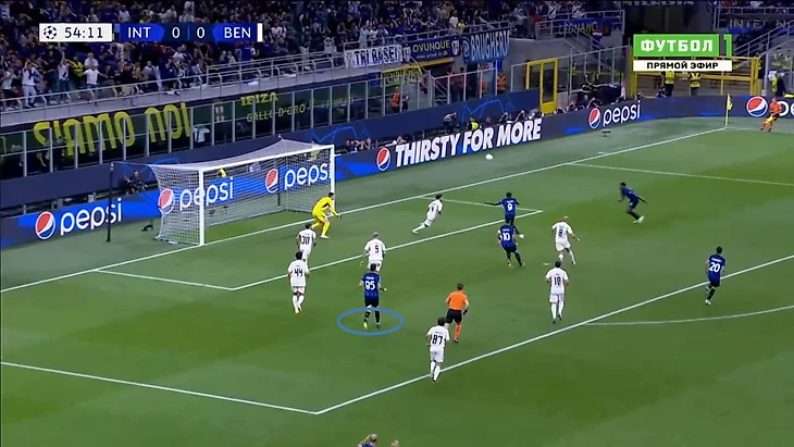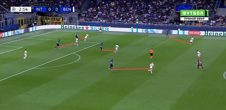 Прессинг не был успешным для Бенфики, но освобождал Интеру свободное пространство, которым тот пользовался, две такие атаки закончились опасными моментами с участием Дюмфриса на дальней штанге. В эпизоде, который представлен ниже Димарко одним пасом отрезает 8 игроков Бенфики, в итоге этот эпизод закончится опасным прострелом Думфриса на замыкающего дальнюю штангу Мхитаряна.