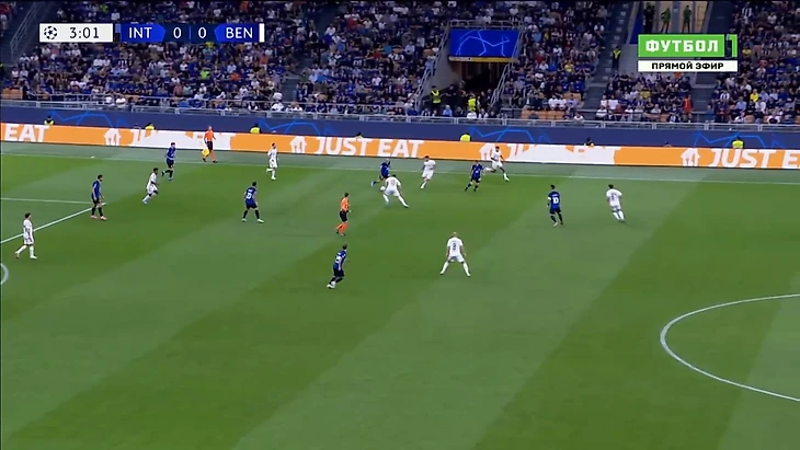 Сначала на фоне атаки Бенфики покажем силу обороны Интера. Почти весь первый тайм и второй тайм примерно с 60 минуты Интер играл вторым номером в обороне. И я скажу, что такая игра в обороне является примером для других команд и подчеркивает физическую готовность Интера.