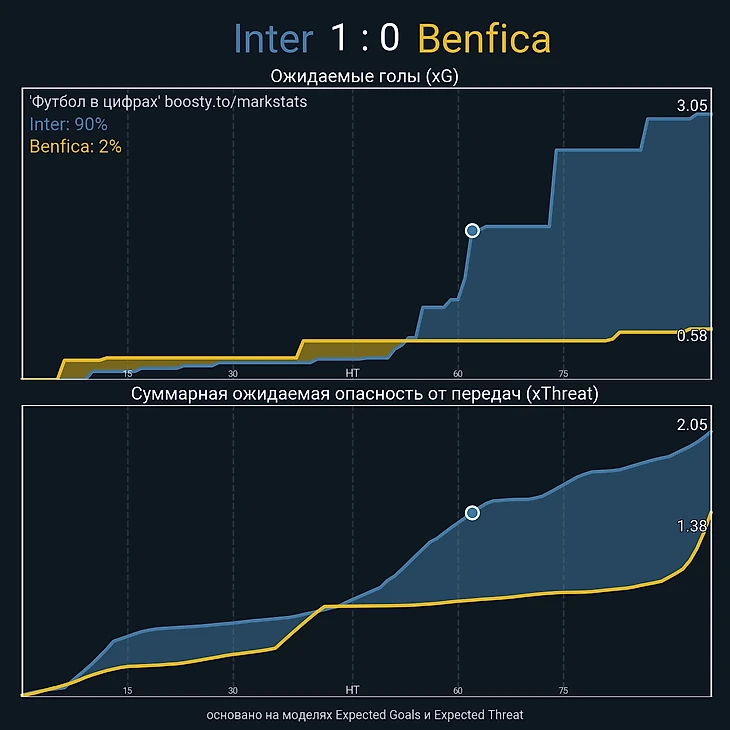 График сверху показывает, что во втором тайме доминировал, что подтверждает выводы сверху.