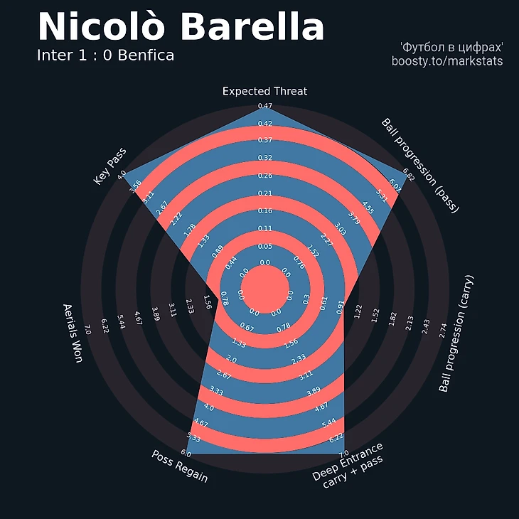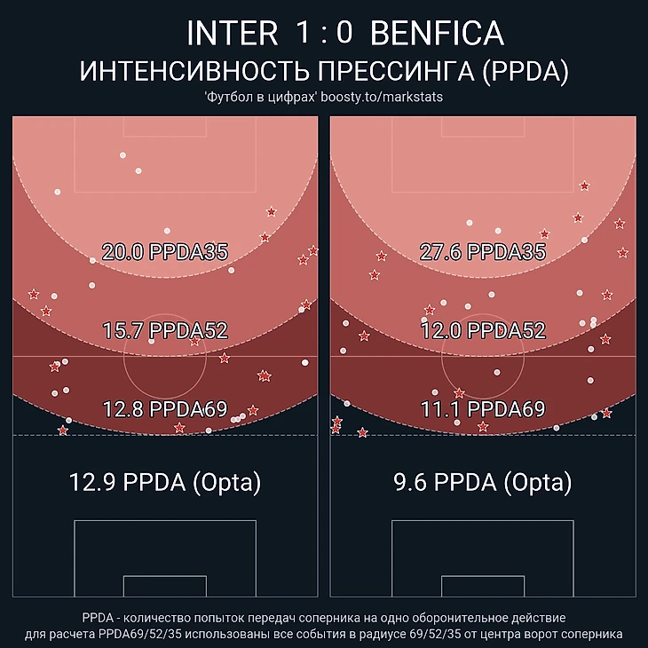 Сказав про прессинг Бенфики нельзя не сказать о прессинге Интера, который в этом матче сыграл важнейшую роль в победе хозяев. Первое что надо сказать, он был не постоянным, а эпизодическим, во многом даже не прессинг, а контрпрессинг особенно во втором тайме, когда команда много владела мячом, и тем не менее он был успешнее, чем у Бенфики в радиусе 35 метров от ворот соперника, что приводило к большому количеству свободных зон у ворот гостей и, соответственно наличию моментов.