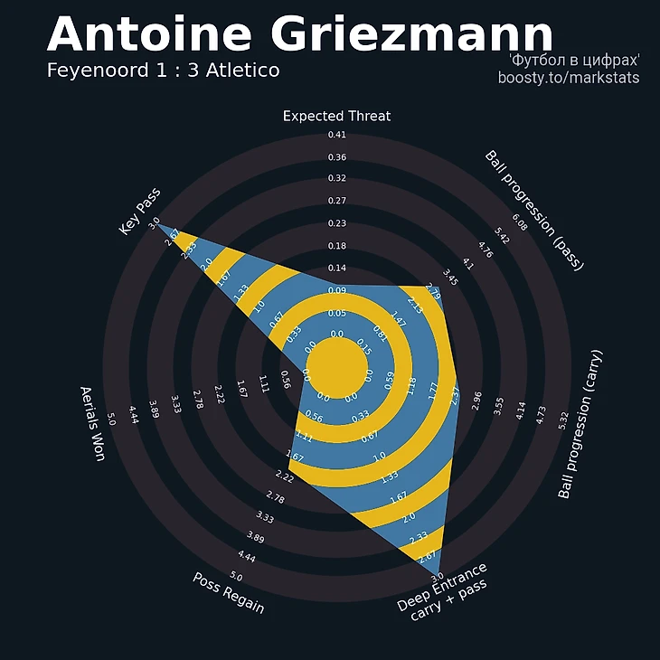 Хочу отдельно выделить игру Гризманна в этом матче, который великолепно связывал игру, раскрывал её, создавал опасные моменты. В матче матрасники создали только 2 момента без участия Гризмана.
