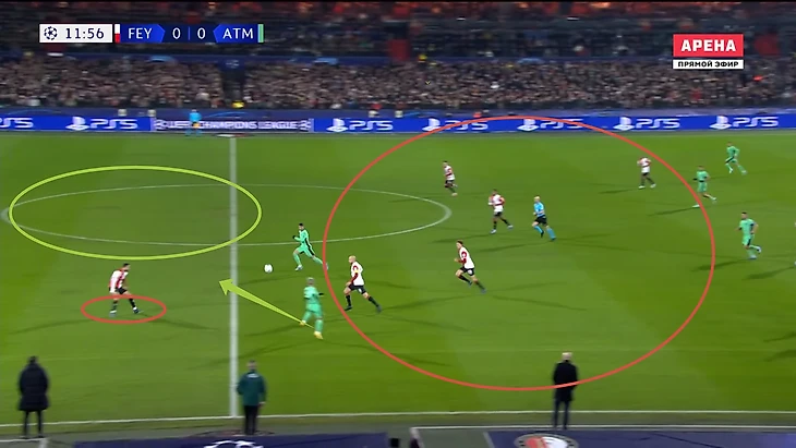 Я не зря выделил то, что именно Рикельме (крайний защитник) накрывает Гертрейду (фланговый защитник), потому что при контрпрессинге фланговых защитников Фейеноорда накрывали фланговый полузащитники из тройки, но при этом особенная роль была у Коке, который замыкал ловушку, и накрывал он ближайшего полузащитника к фланговому защитнику соперника, поэтому его оппонент регулярно менялся, а игрок должен был хорошо читать игровые ситуации.
