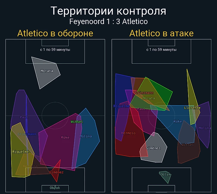 Высокие позиции игроков были нужны Атлетико для проведения атак на пространстве, также сверху оставались Мората и Гризманн, который служил адресатом для передач защитников, так как постоянно открывался и вследствие этого имел возможности для владения мячом.