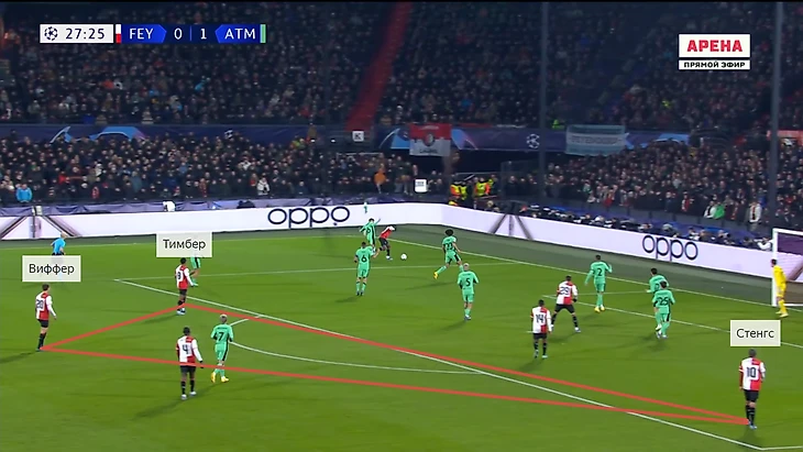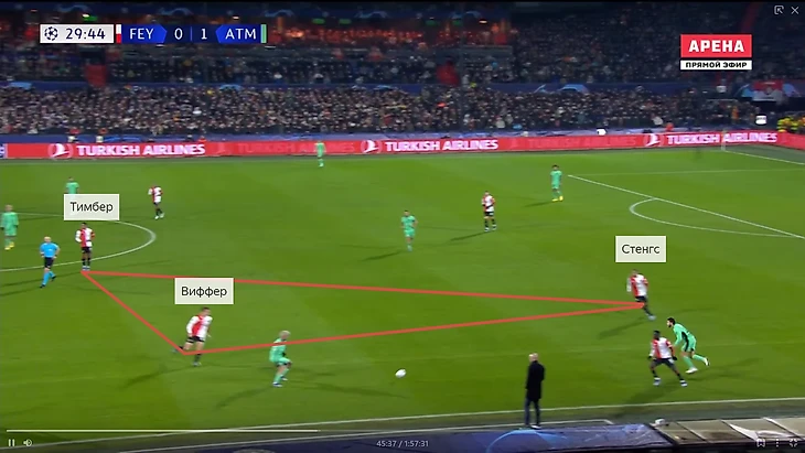 Но при этом стоит отметить гибридную полузащиту Фейеноорда, в которой при прессинге Стенгс находится выше, а другие полузащитники ниже.