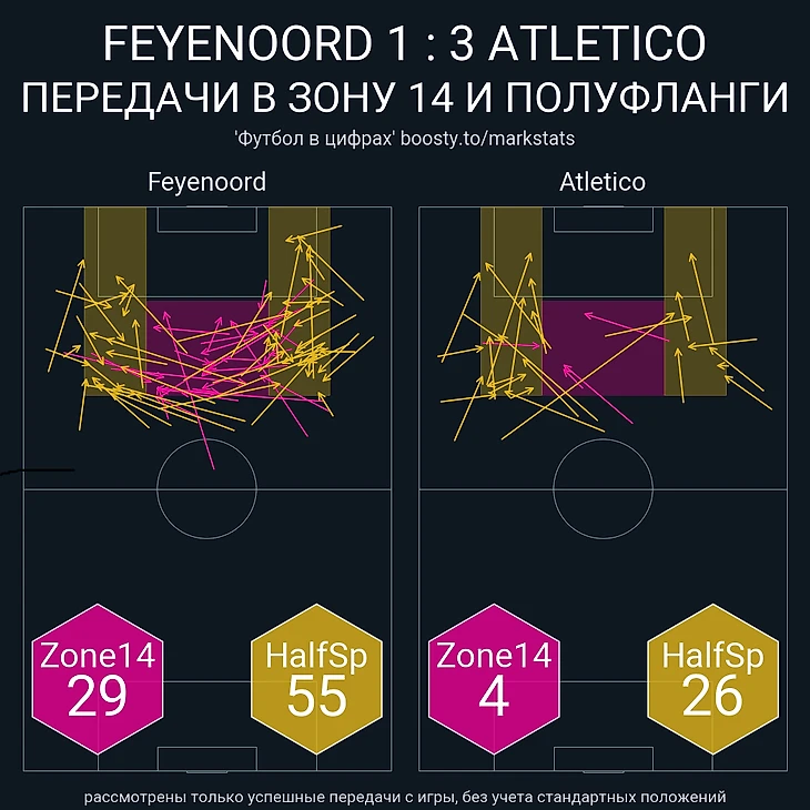 В этом тексте я расскажу про матч 5 тура Лиги Чемпионов Фейеноорд - Атлетико Мадрид. Противостояние вышло интересным и довольно атакующим, поэтому мне приятно про него писать. Но я не буду описывать ход матча, а расскажу про детали в игре команд, которые наиболее сильно определили игру.