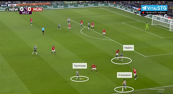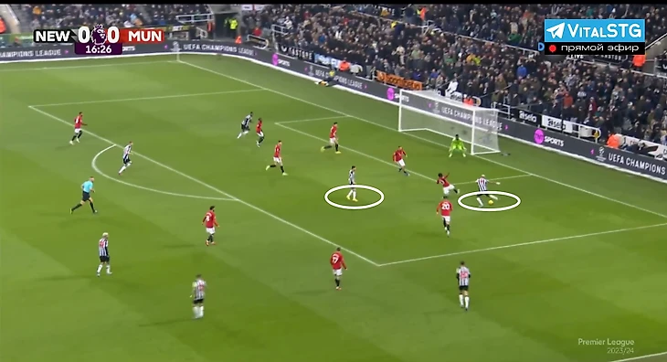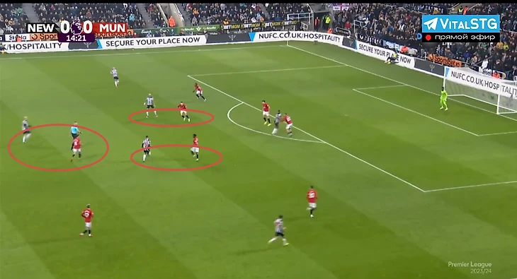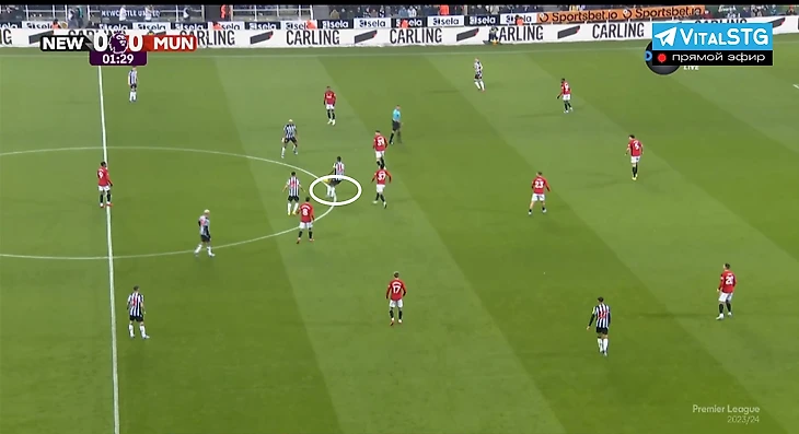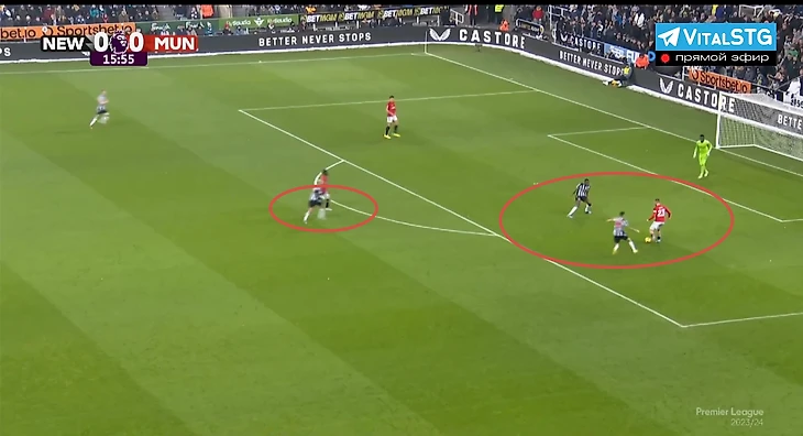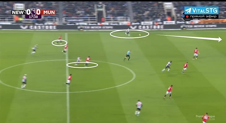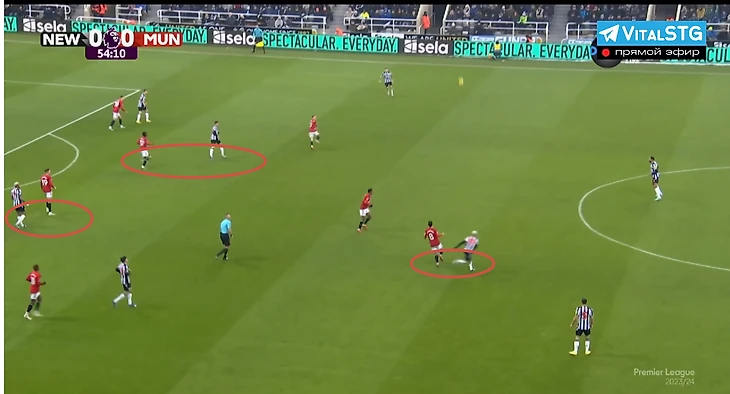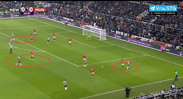 Ну, конечно же, хозяева очень классно прессинговали, и это было выгодно вдвойне, так как у гостей не было достаточного количества пасующих игроков, поэтому конечным итогом розыгрышей был вынос, в результате которого мяч возвращался к Ньюкаслу, так как не было игроков способных в воздухе бороться с защитниками хозяев. Однако стоит похвалить прессинг-план Ньюкасла, потому что он был интенсивным и очень эффективным. Защитники МЮ при розыгрышах находились довольно узко, поэтому Исак и один из вингеров регулярно давили именно на центральных, бросая фланговых защитников, и вследствие высокой интенсивности защитникам перекрывали любые возможности для передач на флангах, так как плотно играли и перекрывали фланги. Оставались возможности для передачи в центр, но с центральными полузащитниками гостей плотно играли полузащитники Ньюкасла, не давая возможности для спокойного получения мяча. При этом для розыгрышей обычно спускался только один полузащитник, а именно Майну, что довольно мало, чтобы преодолеть прессинг.