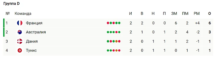 Если Франция проиграет, то проходит вместе с Австралией, если та выиграет. Тунисом, если Австралия и Дания играют вничью.