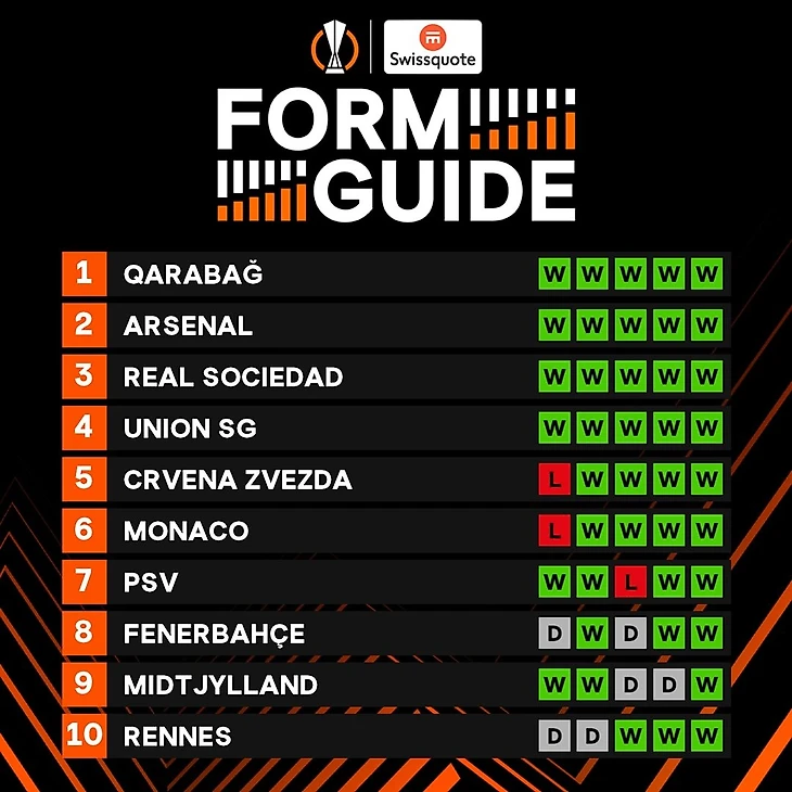 Официальная страница Лиги Европы УЕФА по футболу на «Твиттер» опубликовала топ-10 команд турнира, имеющие наилучшую форму в последних матчах в ЛЕ и национальных чемпионатах.
