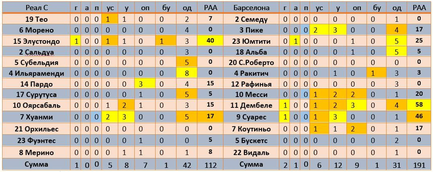 Из рассматриваемых здесь матчей данный получился самым ровным (обратите внимание на пусть и спорный рейтинг РАА, представленный в таблицах для каждой из команд). «Атлетико» набрал больше всего в плане атакующей активности 238 при 111 у соперника, «Барселона» - 191 при 112, а «Реал Мадрид» - 185 при 135. Таким образом, видим, что при доминировании «Атлетико» довольствовался всего лишь ничейным исходом, «Барселона» взяла свое, нанесла только 11 ударов при 6 попаданиях в створ, к слову у «Реал Сосьедад» при 7 ударах 5 в створ, а подопечные Лопетеги, несмотря на то, что 16 раз пробили по воротам в створ попали также, как и каталонцы 6 раз, но вот забили лишь однажды, чего не было достаточно для победы. Собственно, РАА и показывает, что «сливочные» недостаточно старались для победы и их продуктивность ниже, чем у двух других претендентов на титул.