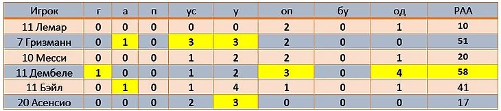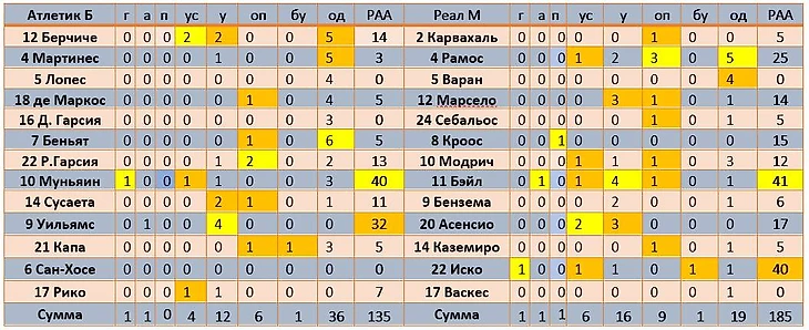 Условные обозначения: мин – сыгранные минуты; г - гол; а – голевая передача; п – предголевая передача, ус -удары в створ; у -удары всего; оп – обостряющая передача (передача, после которой партнер по команде наносит удар), бу – заблокированные удары, од – оборонительные действия (отборы + перехваты). Рейтинг атакующей активности (РАА): гол – 40, голевая передача (заработанный пенальти, забитый пенальти) – 25, предголевая передача – 15, удар в створ – 7, удар мимо– 3, обостряющая передача – 5.