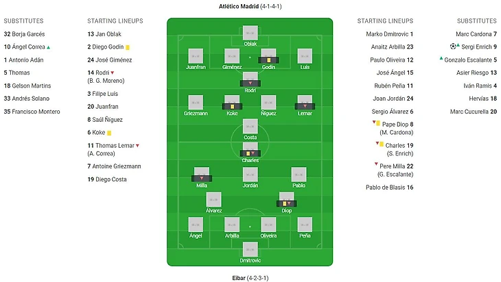 Мощное выступление продемонстрировал Родри Эрнандес – недавний новичок «Атлетико» смотрелся глыбой в центре поля, он как положено первоклассному опорнику вычищал все, до чего дотягивалась его нога, в активе этого футболиста 5 отборов и 2 перехвата, плюс добавим к этому 96% точных передач и получим идеальную замену Габи (в этом плане селекция мадридцев сработала идеально, если, конечно, Родри и дальше продолжит в таком же духе). Когда футболистам «Эйбара» удавалось в центре пройти Эрнандеса, то в большинстве случаев они натыкались на Хименеса. Уругвайский защитник читал игру соперника, как настольную книгу с растрепанным переплетом, что ему и позволило совершить 6 перехватов, к ним он добавил 1 отбор и 2 удара по воротам. Очевидно, что в лице Хименеса уже сейчас выросла достойная замена лидера центра обороны Година. Тем более, что сам Диего в этом матче буквально на минуту, на эту роковую 87ю минуту потерял концентрацию и допустил 2 ошибки подряд. Сначала он катастрофически неточной передачей на своей половине поля отдал мяч сопернику, а затем неуклюже подстроился под прострел и словно подарок на День Рождения преподнёс снаряд Энричу (хотя он родился 26 февраля). Таким образом на 87й минуте гости вышли вперед.