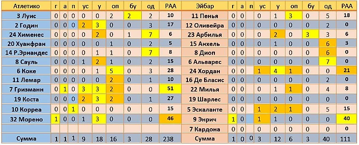 Условные обозначения: г - гол; а – голевая передача; п – предголевая передача, ус -удары в створ; у -удары всего; оп – обостряющая передача (передача, после которой партнер по команде наносит удар), бу – заблокированные удары, од – оборонительные действия (отборы + перехваты). Рейтинг атакующей активности (РАА): гол – 40, голевая передача (заработанный пенальти, забитый пенальти) – 25, предголевая передача – 15, удар в створ – 7, удар мимо– 3, обостряющая передача – 5.
