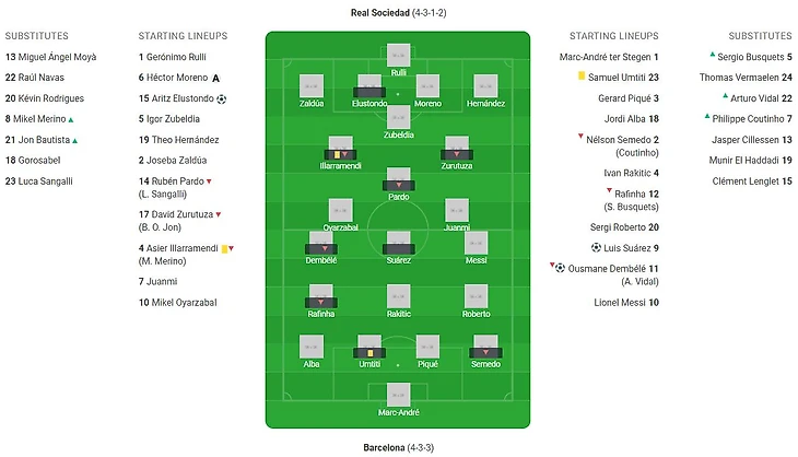 После перерыва Эрнесто Вальверде расписался в собственной ошибке при выборе стартового состава, очевидно, что на одной ноге Реал пусть и Сосьедад не обыгрывается, вышел Коутиньо, заменивший крайнего защитника Семеду, Серхи Роберто, таким образом, сместился на правый фланг обороны. Коутиньо оживил середину поля, плюс добавил агрессии, угрожая своими дальними ударами (такой случился всего один, но он был опасен и зрелищен). На 57й минуте Вальверде второй раз признал ошибку, убрав с поля Рафинью, и поставив на его место Бускетса. Совпадение это или нет, но уже через 6 минут в ворота хозяев влетел первый гол. А через 3 минут после первого – второй. Следует признать, что «Барса» играла откровенно плохо, но сумела буквально запихнуть с мясом 2 мяча. Сначала Суарес после борьбы Юмтити с защитниками соперника при подаче углового оказался в нужном месте в нужное время, а потом Дембеле также после подачи от угла поля при помощи неуверенной игры вратаря соперника Рульи и двух рикошетов вырвал, как оказалось победу. Каталонцы, можно сказать, победили мускулами, задавив соперника. Гвардиолы на них нет. С комбинационной игрой все было плохо, что спишем на экспериментальный состав. Самыми активными и удачливыми в составе гостей оказались Суарес (3 удара – 1 в створ – 1 гол) и Дембеле (2 удара – 1 гол, 3 созданных момента и 4 успешных оборонительных действий). Единственный плюс для фанатов «Барселоны», что их любимцы при не лучшей игре добились победы, и что Дембеле постепенно начинает раскрывать свой потенциал.