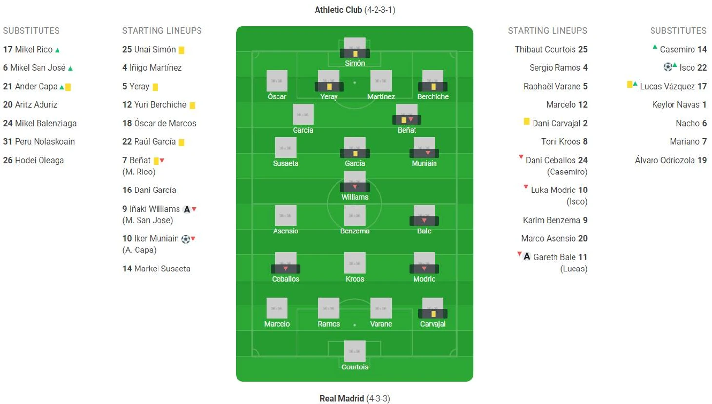 Перейдем к самому матчу. «Атлетик» сразу показал, что легко не собирается дарить очки. Хозяева довольно грамотно оборонялись и быстро бежали в контратаку. К тому же они выигрывали практически всю борьбу в центре поля. Все это способствовало созданию нескольких моментов ударами отметились Уильямс и Сусаета. До поры до времени выстрелам не хватало точности, пока на 32 минуте не был в клочья разорван левый фланг обороны «Реала» (скажите спасибо Марсело и Рамосу). Прострел привел к тому, что Уильямс и Муньяин синхронно запихали круглого в сетку (одно из закономерностей этого тура фавориты всегда пропускали первыми). После этого мадридцы могли пропустить и второй, но из офсайда забивать пока нельзя.