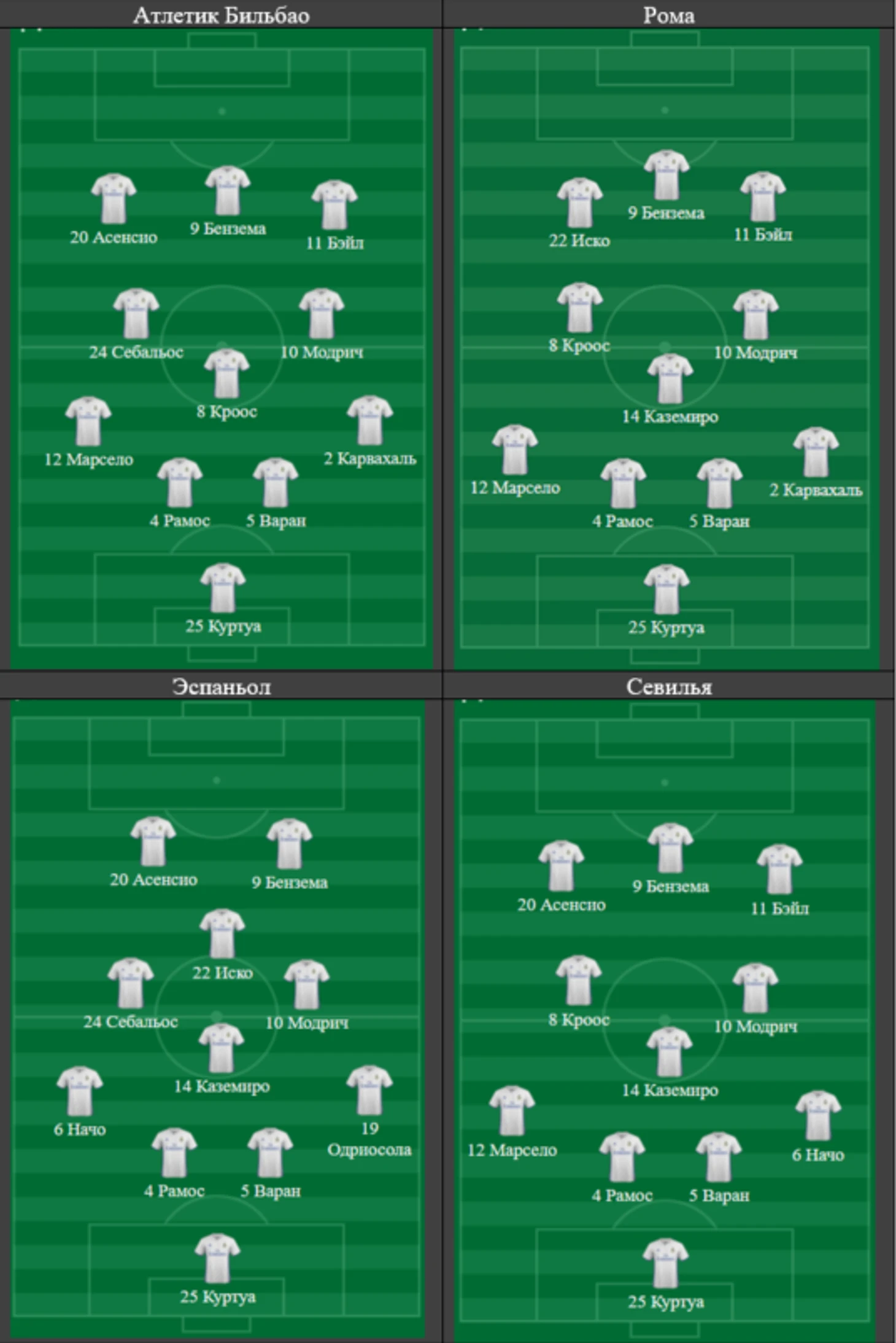 Теперь заглянем в глубину, а именно в тактические схемы и скрытые резервы. Лопетеги использовал в данных поединках 2 основные схемы: 4-3-3 (с одним опорником, в роли которого чаще всего выступал Каземиро и однажды Кроос) и 4-4-2 (с ромбом в центре поля). Из-за необходимости ротации мы видели разные варианты стартовых составов, из которых стало очевидно, что Начо, Марсело, Одриосола и Карвахаль в принципе взаимозаменяемы и качество игры от этого особо не страдает, хотя, нужно признать, что в отвратительной форме сейчас находится Марсело, на которого, возможно, оказало влияние небольшое повреждение. Особое же внимание нужно уделить полузащите. Например, Лопетеги нужно понять, что использование Крооса в роли опорника – провальный вариант. Хулен использовал данную схему в игре против Бильбао. И пока не вышел во втором тайме Каземиро вместо Себальоса, мадридцы проигрывали центр поля «Атлетику». По-настоящему опасные моменты у ворот соперника мадридцы начали создавать ближе к 60й минуте, когда появился Иско, заменивший Модрича, собственно испанец и забил единственный мяч. Да и вообще именно после выхода Иско подопечные Лопетеги начали наращивать давление на ворота «Атлетика», но забить больше не успели.