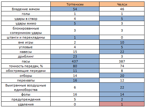 Очень противоречивый матч выдали команды. С одной стороны «Тоттенхэм» больше владел мячом и был гораздо острее в первом тайме, с другой, футболисты «Челси» после перерыва заметно прибавили и добились преимущества по ударам в створ (5 против 4), а также за счет, в первую очередь, навесов (22 против 15) оказали внушительное давление на оборону хозяев.