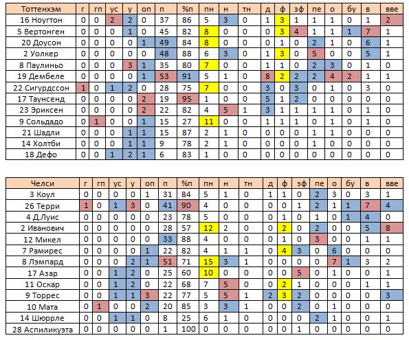Вообще, в созидании игроки «Челси» выглядели непривычно бледно. Ни Азар, ни Оскар не могут занести этот матч к себе в актив, особенно если взглянуть на точность их передач (60% и 68% соответственно). Лэмпард, как истинные боец, пытался вести за собой, он раздал больше всех передач (51), из которых 1 была обостряющей, и нанес 2 удара, а также стал лидером по количеству отборов, которых у него набралось целых 7, а к ним он добавил 1 заблокированный удар и 3 выноса. К Фрэнку по этой встречи сложно предъявить какие-либо претензии.