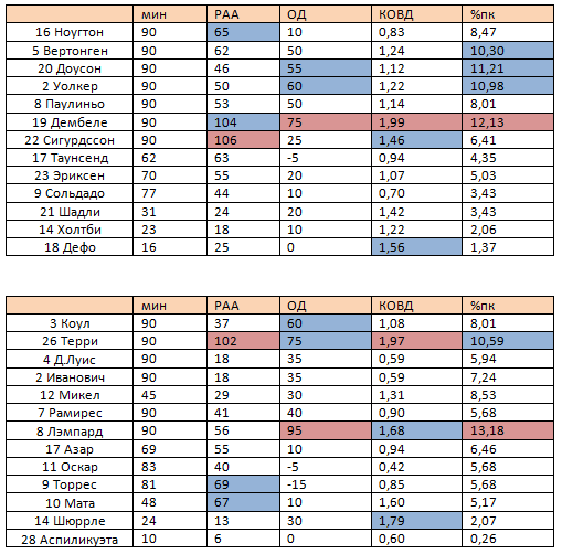 У «Тоттенхэма» собралась вполне боеспособная банда, в которой есть несколько очень интересных игроков. Например, Таунсенд и Эриксен часто принимают не стандартные решения и не боятся демонстрировать свою технику, единственное, что их пока не хватает на весь матч. Постепенно на лидирующие позиции выходит Сигурдссон, который своими ударами еще принесет, наверняка, немало пользы команде. Особенно хотелось бы отметить по этому матчу Дембеле. Мусса взял на себя диспетчерские функции, он раздал 53 паса с точностью 91%, из которых 1 была под удар, кроме этого он 8 раз успешно применил дриблинг и заработал на себе 2фола. Бельгиец и в обороне отрабатывал стабильно. Он сделал 2 перехвата, 4 отбора, 1 вынос и заблокировал 2 удара.