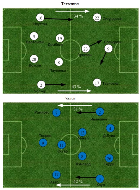 Моуринью явно перемудрил с составом, выпустив одновременно и Рамиреса, и Микела, и Лэмпарда, при этом бразилец отправился на правый фланг. То ли данное обстоятельство повлияло, то ли настрой футболистов «Тоттенхэма», желающих доказать, что они готовы биться за самые высокие места, но к перерыву хозяева должны были вести минимум с разницей в 2 мяча. На 20й минуте после прекрасной комбинации счет открыл Сигурдссон. Эриксен перетащил мяч из центра к флангу, приведя за собой Лэмпарда, на него же вышел и Д.Луис, освободив центральную зону. Далее датчанин выдал пас на Сольдадо, а испанец в одно касание вывел Сигурдссона на рандеву с Чехом. Терри в подкате не смог помешать Гилфи поразить ворота «Челси».