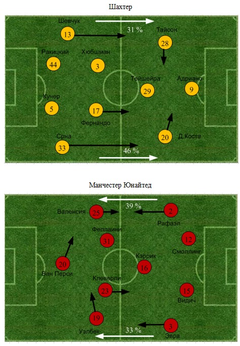 Мирча Луческу особенно ничем не удивил, а вот его оппонент избрал достаточно неожиданную расстановку. Он отправил Кэрика на позицию «а-ля Пирло», а перед ним расположил Феллаини и Клеверли. Если Майкл со своими обязанностями справился, он и передач больше всех отдал – 65 (94% точность) и в обороне отрабатывал старательно – 1 отбор, 2 перехвата и 2 выноса, то вот от игры его товарищей по центру поля ждали большего, особенно в созидании. Они на двоих сделали 1 обостряющую передачу, ни разу не пробили по воротам и заработали на себе 3 фола. Феллаини еще поучаствовал в забитом мяче, но там не так уж велика его заслуга. После прострела Маруана Ракитцкий допустил ошибку, а этого только и ждал Уэлбек.