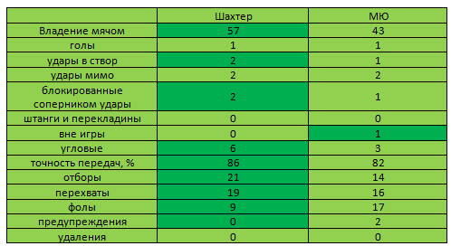 Как видим, «Шахтер» имел весьма солидное преимущество по владению мячом – около 57%, что говорит о преимуществе хозяев в центре поля, оно было добыто, за счет игры в опорной зоне, где особенно старался Хюбшман, он сделал 3 отбора и 2 перехвата. Также подопечные Луческу бережнее обращались с мячом и показали 86% точных передач против 82 у оппонентов. Нельзя не упомянуть, что игроки «Шахтера» сделали на 7 отборов и 3 перехвата больше. По остальным показателям установилось примерное равенство.