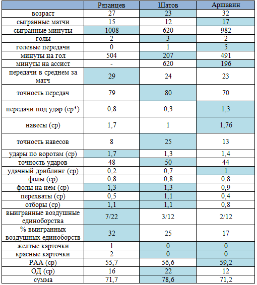 Рязанцев, скорее всего, за место в составе будет конкурировать с двумя другими россиянами: Шатовым и Аршавиным. Взглянем на цифры