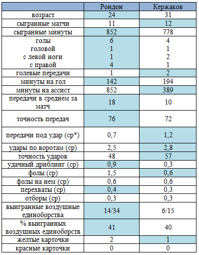 Итак, Рондон имеет ряд преимуществ по сравнению с Кержаковым. Во-первых, он моложе, ему всего 24 года, в то время как Александру уже стукнуло 31. Во-вторых, Рондон играет более результативно, он забил 6 мячей против 4 у конкурента, а на 1 гол ему требуется 142 минуты, что на 52 меньше, чем Кержакову, и не будем забывать, что у «Рубина» были серьезные проблемы с результативностью. В-третьих, Саломон способен создать себе момент без помощи партнеров, он по 0,9 раза успешно применяет дриблинг, Александр же в последнее время очень редко идет в обводку (всего 0,3 в среднем за встречу). В –четвертых, Рондон лучше себя чувствует в воздухе, он принял участие в 34 верховых дуэлях, из которых выиграл 14 (41%), так как «Зенит» обладает очень активными флангами, то данное качество нападающего не будет лишним. В-пятых, Рондон играет большую роль при распасовке мяча, он выполняет по 18 пасов в среднем против 10 у конкурента. Несмотря на все вышесказанное, не стоит раньше времени списывать Александра. Он еще не сказал своего последнего слова. Кержаков немного превосходит бывшего нападающего «Рубина» в умении создавать моменты для партнеров, он выполняет по 1,2 передачи под удар против 0,7, что позволило ему стать автором 2 результативных передач (у Рондона только 1), Также он чаще и, как это неудивительно, с большей точностью наносит удары по воротам: 2,8 в среднем с 57% точности против 2,5 при 48% попаданий в створ. Практически нет сомнений, что при сегодняшнем уровне игры Рондон вытеснит Кержакова из состава «Зенита». Будем надеяться, что конкуренция подстегнет Александра, и на чемпионат мира он поедет с огромной мотивацией и в своей лучшей форме.