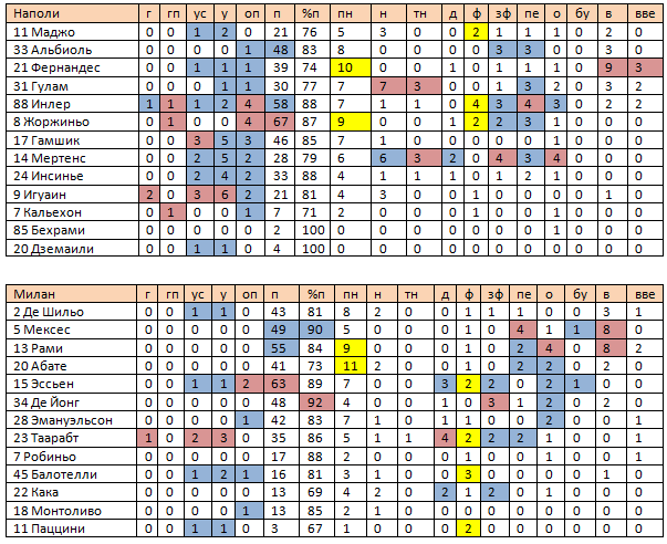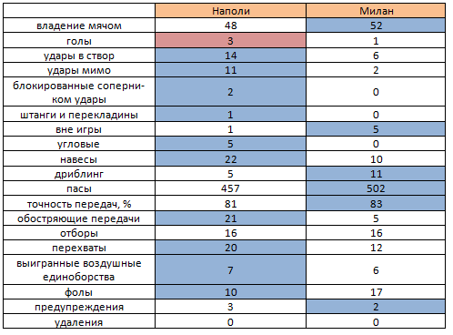 Игуаин делал все то, что и должен нападающий, он держал Аббьяти в постоянном напряжении, на его счету 6 ударов (3 в створ) и 2 созданных момента для партнеров. Но не Игуаином единым славилась атака хозяев, Гамшик, Инсинье и Мертенс обрушили просто град ударов на ворота соперника. На троих у них набралось 14 выстрелов, из которых 7 пришлись в створ. Нельзя не отметить, что этой атакующей группе удавалось неплохо комбинировать и 7 обостряющих передач лишнее тому подтверждение. Лучше других из данной троицы выглядел Мертенс. Бельгиец не только 5 раз примерился к воротам «Милана», дважды вывел партнера на ударную позицию и два раза успешно применил дриблинг, но еще и проделал огромную работу в обороне, собрав коллекцию из 3 перехватов и 4 отборов. Дрис просто разрывал в первом тайме левый фланг обороны гостей, чем вынудил Зеедорфа произвести перестановки: выдвинуть Эмануэльсона вперед, а Де Шильо переставить с правой на левую бровку. Хотя данный ход тренера «Милана» и сработал, но изменить ход матча он не мог. Появление на поле Кака, Монтоливо и Паццини немного преобразило игру гостей, но все их усилия оказались тщетными, футболисты «Наполи» одержали вполне закономерную победу и продолжают вести ожесточенную борьбу с «Фиорентиной» за третью строчку турнирной таблицы. На данный момент подопечные Бенитеса опережают «фиалок» на 3 балла.