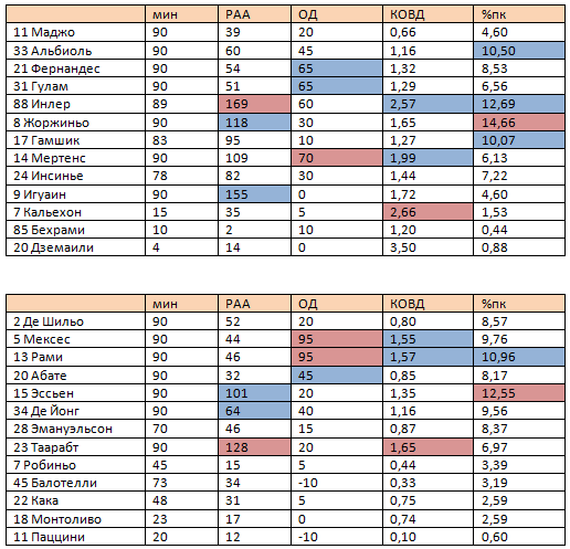 Рейтинг атакующей активности (РАА): гол – 50, голевая передача (заработанный пенальти, забитый пенальти) – 25, точная передача– 1, удар в створ – 10, удар мимо– 5, обостряющая передача – 5, удачный дриблинг– 5, заработанный штрафной – 5, навесы: точные – 3, неточный – 1. Рейтинг оборонительных действий (ОД): перехват - 10, отбор – 10 и блокированный удар – 10, выносы мяча из своей штрафной - 5, фолы – (-5). Коэффициент объема выполненных действий (КОВД) определяется по формуле (РАА+ОД)/мин, то есть он равен сумме выполненных действий футболиста деленной на проведенные минуты. %пк – процент передач игрока от общего количества передач команды.