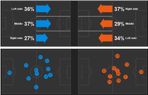 В этом поединке на счету швейцарца кроме голевых подвигов значатся 2 удара и 4 обостряющие передачи, еще он отлично отработал в обороне, что подтверждают 4 перехвата, 3 отбора и 2 выноса. Неплохо себя проявил и партнер Инлера по опорной зоне Жоржиньо. На нем лежали основные диспетчерские функции, он сделал больше всех передач в матче – 67, из которых 4 выводили партнеров на ударные позиции, и одна стала голевой. В обороне он также отработал неплохо, записав на свой счет 3 перехвата и 1 отбор.