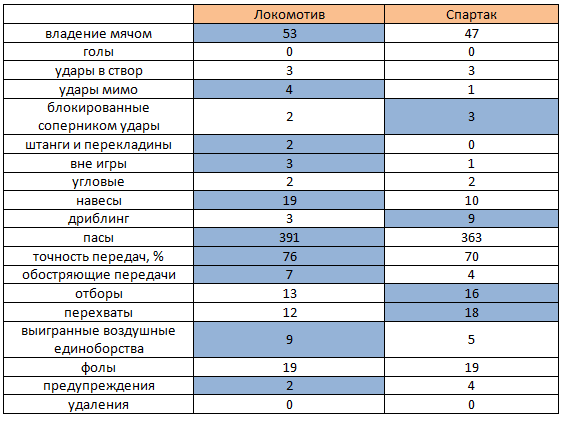 Безусловно, хозяева поля были ближе к победе, они создали несколько очень опасных моментов, чего только стоят 2 попадания в каркас ворот. «Локомотив» превзошел своих соперников по владению мячом (53%), по ударам по воротам (9 против 7), по навесам (19 против 10), по выигранным воздушным единоборствам (9 против 5) и по обостряющим передачам. Игра подопечных Кучука смотрелась более целостно, у них проходили неплохие комбинации, в отличие от спартаковцев, которые практически ничего не создали впереди, и только индивидуальные проходы отдельных игроков хоть как-то оживляли обстановку у ворот Абаева (9 удачных обводок против 3 у хозяев). Илья откровенно проскучал весь матч. Нельзя сказать, что оборона «красно-белых» была безупречна, но, тем не менее, по основным защитным показателям они оказались лучше. Гости выполнили на 3 отбора, 6 перехватов и 1 заблокированный удар больше. Конечно, отдельное спасибо болельщики «Спартака» должны сказать Диканю. Андрей все сделал для того, чтобы его команда не пропустила: совершил несколько сейвов, вовремя подстраховывал защитников и не ошибался на выходах.