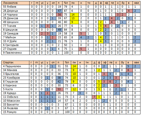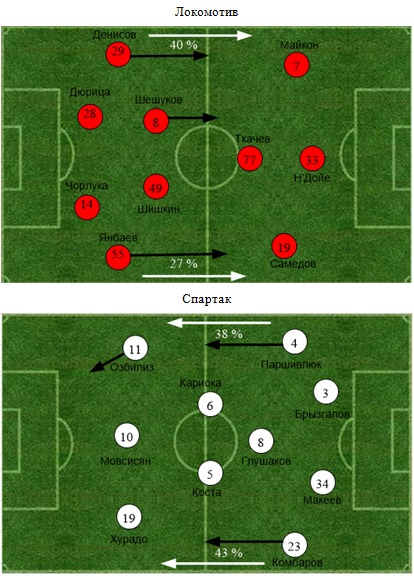 Серьезным ударом по атакующим амбициям хозяев стали повреждения перед самым матчем Буссуфа и Диарра. Кучуку пришлось перекраивать центр поля. В опорной зоне появились Шишкин и Шешуков, а перед ними расположился Ткачев. Если в обороне все осталось от таких перестановок стабильно, игроки грамотно закрывали свои зоны, а Шишкин и вовсе был одним из лучших в разрушении, собрав коллекцию из 4 перехватов, 1 отбора, 2 выносов и 1 заблокированного удара, то вот в созидании креативности заметно поубавилось. По большому счету только Ткачев активно лез вперед, он трижды примерялся к воротам Диканя, однажды после его удара мяч рикошетом от защитника «Спартака» угодил в штангу, еще он создал 1 момент для партнера и заработал на себе 4 фола. Но одного пусть и старательного Сергея оказалось мало, комбинациям «Локомотива» явно не хватало мысли, последнего паса, из-за этого больше других страдал Н’Дойе, до которого мячи редко доходили. Чаще всего ему приходилось вести борьбу за каждый пас. Даме в целом был заметен, но всего 2 неточных удара, 1 обостряющий пас и 3 заработанных на себе штрафных вряд ли могут его сильно порадовать.