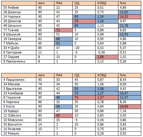 Рейтинг атакующей активности (РАА): гол  – 50, голевая передача (заработанный пенальти, забитый пенальти) – 25, точная передача– 1, удар в створ – 10, удар мимо– 5, обостряющая передача – 5, удачный дриблинг– 5, заработанный штрафной – 5, навесы: точные – 3, неточный – 1. Рейтинг оборонительных действий (ОД): перехват - 10, отбор – 10 и блокированный удар – 10, выносы мяча из своей штрафной - 5, фолы – (-5). Коэффициент объема выполненных действий (КОВД) определяется по формуле (РАА+ОД)/мин, то есть он равен сумме выполненных действий футболиста деленной на проведенные минуты. %пк – процент передач игрока от общего количества передач команды.