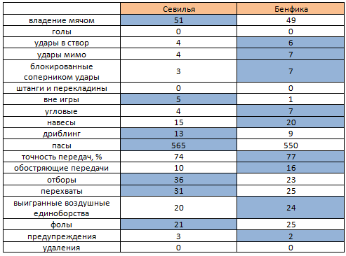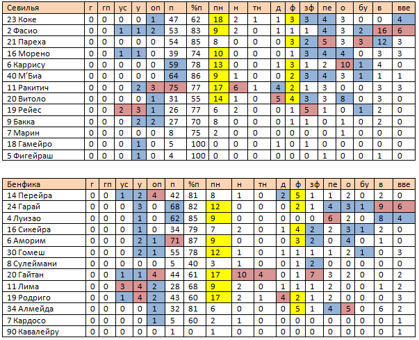 Не последнюю роль в итоговом успехе сыграли и опорники «Севильи». Каррису и М’Биа свое дело знали. Даниэл и вовсе отметился поразительной статистикой по отборам, коих у него набралось целых 10 штук, для сравнения у всех игроков «Бенфики» в сумме всего 23.