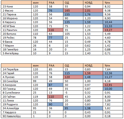 Рейтинг атакующей активности (РАА): гол – 50, голевая передача (заработанный пенальти, забитый пенальти) – 25, точная передача– 1, удар в створ – 10, удар мимо– 5, обостряющая передача – 5, удачный дриблинг– 5, заработанный штрафной – 5, навесы: точные – 3, неточный – 1. Рейтинг оборонительных действий (ОД): перехват - 10, отбор – 10 и блокированный удар – 10, выносы мяча из своей штрафной - 5, фолы – (-5). Коэффициент объема выполненных действий (КОВД) определяется по формуле (РАА+ОД)/мин, то есть он равен сумме выполненных действий футболиста деленной на проведенные минуты. %пк – процент передач игрока от общего количества передач команды.