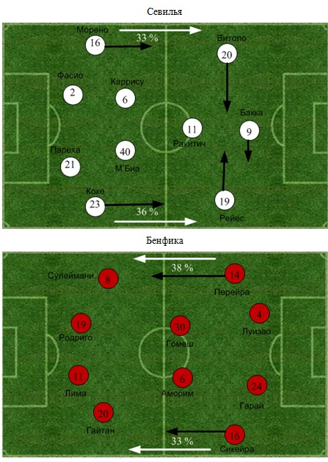 Футболисты «Бенфики» атаковали острее, у них выделялись Гайтан, Лима, Родриго и Перейра. Крайний защитник Макси Перейра после того, как травмировался Сулеймани получил полную свободу действий, он очень активно ходил вперед, даже имел реальную возможность открыть счет в матче в конце первого тайма, но Бету был против такого хода событий. 14й номер португальской команды всего нанес 2 удара и создал целых 4 момента для партнеров. Николас Гайтан был одним из самых больших раздражителей для оборонцев соперника, его особенно не щадили, о чем свидетельствуют 7 нарушений правил. Аргентинец чаще других подавал в штрафную «Севильи» - 10 раз, что позволило ему стать автором 4 обостряющих передач. Наибольшая же угроза для ворот Бету исходила от пары форвардов Лимы и Родриго. Они на двоих нанесли 8 ударов, 4 раза попали в створ и отметились 4 обостряющими передачами. Нападающие постоянно создавали остроту, но в решающий момент им раз за разом не хватало точности и хладнокровия.