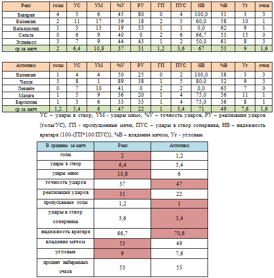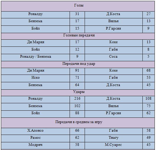 Статистика, представленная в таблице выше, довольно красноречива и в особых комментариях не нуждается. Отметим, что Роналду в 40 поединках забил 47 мячей и отдал 12 голевых передач, Турану с его скромными 7 и 5 соответственно просто нечего противопоставить португальцу. Марсело также смотрится значительно лучше Хуанфрана особенно в атаке. Бразилец имеет преимущество по таким показателям как: голевые передачи (7 против 5), созданные моменты (1,7 против 0,9), передачи в среднем за игру (47 против 33), удары (0,9 против 0,2), удачный дриблинг (1,3 против 0,8) и отборы (2,5 против 2,3). Закрыть эту бровку футболистам «Атлетико» будет невероятно сложно, тем более, что Анчелотти может еще и усилить эту зону, выпустив в центре поля Ди Марию. Анхель в этом сезоне засверкал совершенно другими более яркими красками. Он стал лучшим ассистентом чемпионата Испании, оформив 17 голевых передач, также он лучший игрок «Реала» по количеству созданных моментов для партнеров – 91.