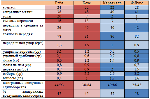 На Коке как обычно будет лежать большая ответственность. Ему нужно будет вместе с Филипе Луисом и левый фланг закрыть, и в атаке что-нибудь придумать. Вообще на этой бровке развернется интереснейшее сражение Бэйл и Карвахаль встретятся лицом к лицу с Коке и Луисом. Взглянем на цифры (Чемпионат Испании + Лига чемпионов).