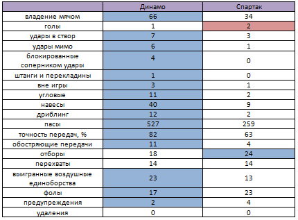 Статистика более чем красноречиво демонстрирует полное превосходство динамовцев по всем показателям за исключением отборов (18 против 24) и самое главное забитых мячей. Хозяева нанесли 17 ударов, из которых 7 попали в створ ворот, у спартаковцев же всего 4, и три из них в створ. Стоит отдать, конечно, должное точности выстрелов гостей (75%), не подвела их и реализация моментов. Футболисты «Динамо» по большому счету должны винить только себя в том, что не сумели додавить соперника и взять хотя бы 1 очко.
