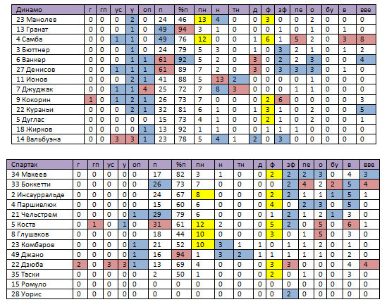 Опорные полузащитники «Динамо» продемонстрировали гораздо более стабильную и качественную игру. Они разрушали практически все замыслы соперника в центре поля. Денисов и Ванкер не только умело распределяли передачи (по 61 пасу) и при возможности обостряли игру (2 удара, 2 созданных момента для партнеров и 6 успешных обводок на двоих), но и собрали неплохую коллекцию из 5 перехватов и 6 отборов.