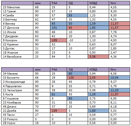Рейтинг атакующей активности (РАА): гол – 50, голевая передача (заработанный пенальти, забитый пенальти) – 25, точная передача– 1, удар в створ – 10, удар мимо– 5, обостряющая передача – 5, удачный дриблинг– 5, заработанный штрафной – 5, навесы: точные – 3, неточный – 1. Рейтинг оборонительных действий (ОД): перехват - 10, отбор – 10 и блокированный удар – 10, выносы мяча из своей штрафной - 5, фолы – (-5). Коэффициент объема выполненных действий (КОВД) определяется по формуле (РАА+ОД)/мин, то есть он равен сумме выполненных действий футболиста деленной на проведенные минуты. %пк – процент передач игрока
