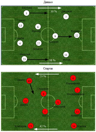 Атаки динамовцев по большей части строились через фланги. Бюттнер и Джуджак бороздили левую бровку (30% атак), а Манолев и Ионов правую (38% атак). Периодически хозяева грешили большим количеством навесов. Один только Ионов выполнил 13 кроссов, из которых, правда, только 2 были точными. Для сравнения у всех игроков «Спартака» всего 9 навесов. Балаж был продуктивнее, он подал 8 раз, из них 3 дошли до цели, плюс еще четырежды выводил партеров на ударные позиции. Неплохо вписался в состав новичок «Динамо» Александр Бюттнер, он даже умудрился поразить сетку ворот Ребров, но гол был отменен из-за офсайда. Дискуссионное решение арбитра.