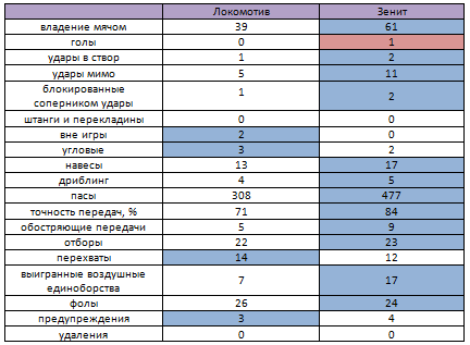 Нужно сказать, что качество игры команд оставляло желать много лучшего. Соперники на двоих всего 3 раза попали в створ, хотя примерялись к воротам в сумме 22 раза. Тем не менее, победу питерцев нельзя назвать незаслуженной. Подопечные Виллаш-Боаша по большинству показателей смотрелись предпочтительнее своих оппонентов, начиная с процента владения мячом (61%) и выстрелов по воротам (15 против 7) и заканчивая количеством навесов (17 против 13) и числом выигранных воздушных единоборств (17 против 7). Еще отметим, что у «Локомотива» наблюдались проблемы с точностью передач, только 71% пасов доходили до адресатов, в связи с этим страдал выход из обороны в атаку, что является одним из определяющих моментов при игре вторым номером.